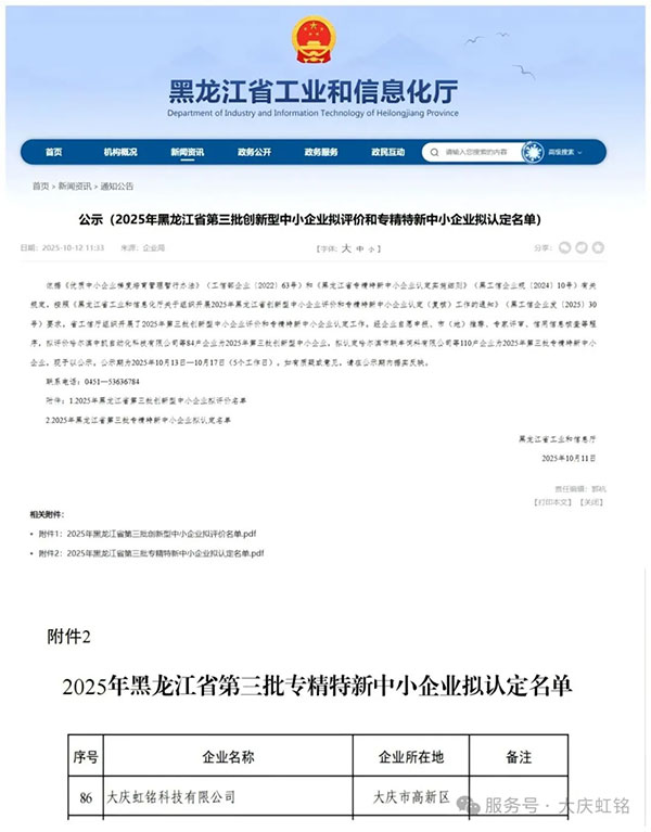 近日,黑龍江省工業(yè)和信息化廳公布了2025年度專精特新中小企業(yè)名單。憑借在**領(lǐng)域的深厚積淀、突出的創(chuàng)新能力以及穩(wěn)健的發(fā)展態(tài)勢(shì),大慶虹銘科技有限公司順利通過(guò)評(píng)審,成功躋身省級(jí)專精特新中小企業(yè)行列。
